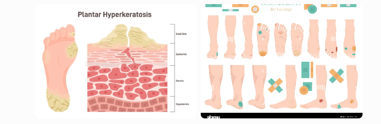 (Images above illustrate normal skin versus areas affected by calluses/corns, showing thickened, hardened layers on the foot and cross-sectional views of hyperkeratosis.)