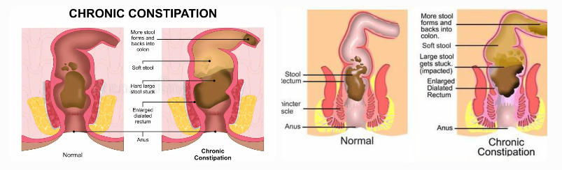 (Images above show a clear comparison of normal bowel movement versus chronic constipation with hard, impacted stool, enlarged rectum, and backed-up colon.)