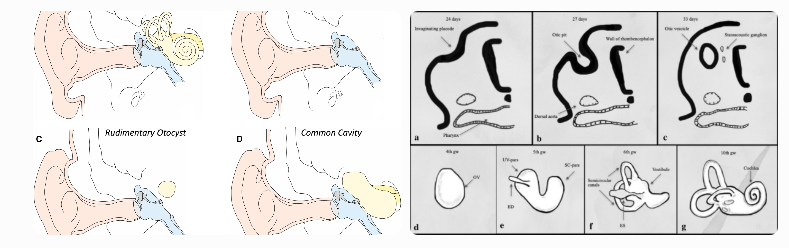 (Images above illustrate normal inner ear structures versus common congenital malformations such as labyrinthine aplasia, rudimentary otocyst, and common cavity deformity that can cause congenital deafness.)