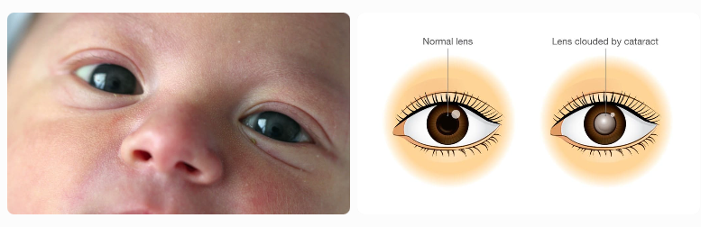 - Eye abnormalities — cataracts (cloudy lens, white pupillary reflex), glaucoma, retinopathy ("salt and pepper" appearance)