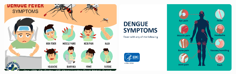 (Images above show common symptoms of dengue like high fever, severe headache, muscle and joint pain, rash, and warning signs.)