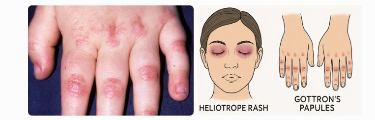 - Skin rash: Violet or reddish-purple rash on the eyelids (heliotrope rash), face, neck, upper chest (shawl sign), back, elbows, and knuckles (Gottron’s papules)