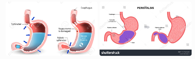 (Images above show diabetic gastroparesis — normal stomach with proper emptying versus delayed gastric emptying with food remaining in the stomach due to damaged vagus nerve.)
