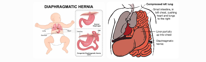 (Images above show diaphragmatic hernia — abdominal organs such as intestines or stomach protruding through a defect in the diaphragm into the chest cavity, compressing lungs and shifting the heart.)