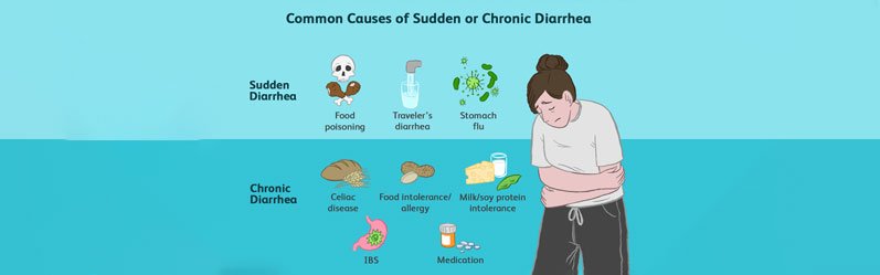 (Images above show the difference between normal bowel movement and diarrhea with loose, watery stools and rapid transit through the intestines.)