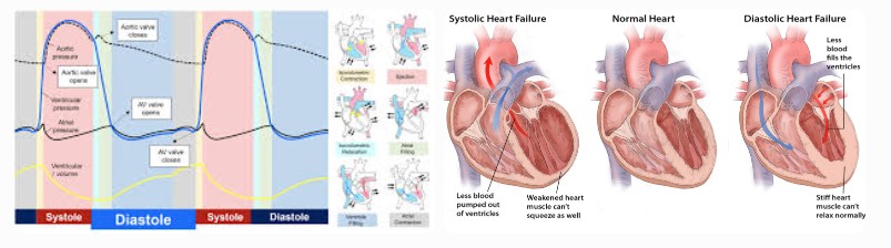 (Images above show normal heart filling during diastole compared to diastolic dysfunction — stiff left ventricle with impaired relaxation and reduced filling.)