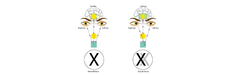 (Images above show double vision — a person seeing two overlapping images of the same object, along with common causes involving eye muscle or nerve problems.)