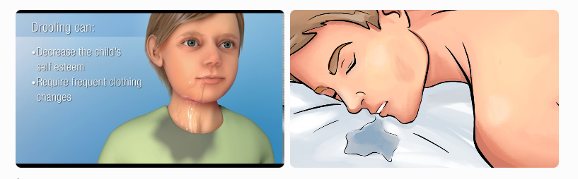 (Images above show typical drooling — saliva dripping from the mouth, especially noticeable during sleep or in children.)