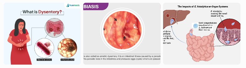 (Images above show amoebic dysentery — inflammation of the colon, presence of the parasite Entamoeba histolytica, and typical bloody-mucoid stools.)
