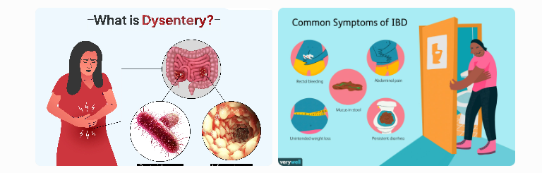 (Images above show typical features of dysentery — severe abdominal pain, inflamed colon, bloody and mucous stools, and rectal bleeding.)