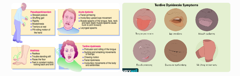 (Images above illustrate common features of dyskinesia, particularly tardive dyskinesia — involuntary tongue protrusion, lip smacking, facial grimacing, eye blinking, and writhing movements of the body.)