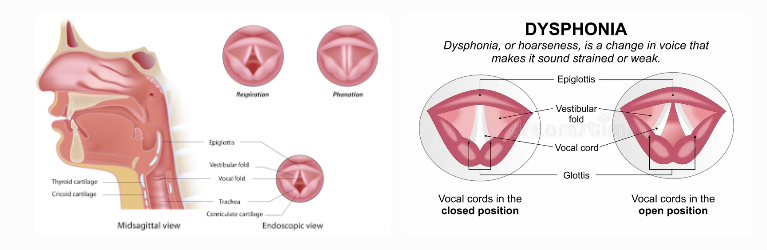 (Images above show the larynx and vocal cords — normal vocal cord position during breathing and phonation, and how irregularities can cause dysphonia or hoarseness.)
