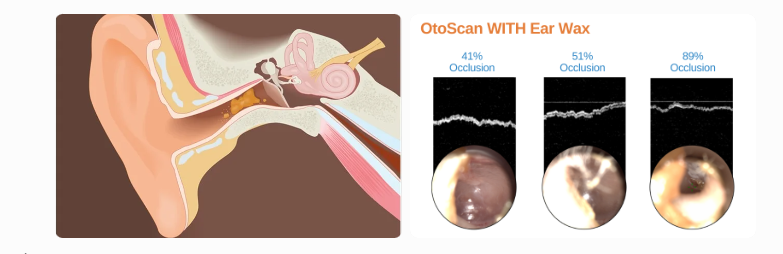(Images above show earwax blockage — hardened cerumen obstructing the ear canal, visible on otoscopy with partial or near-complete occlusion.)