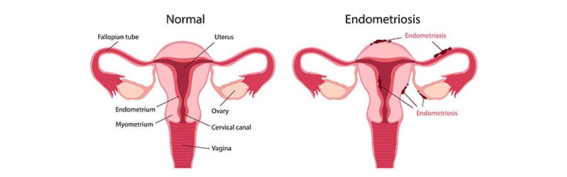 (Images above show endometriosis — endometrial-like tissue implants outside the uterus, causing dark chocolate cysts on ovaries, adhesions, and pelvic inflammation.)
