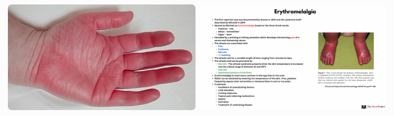 (Images above show erythromelalgia — red, swollen, burning hands or feet with marked erythema during an attack.)