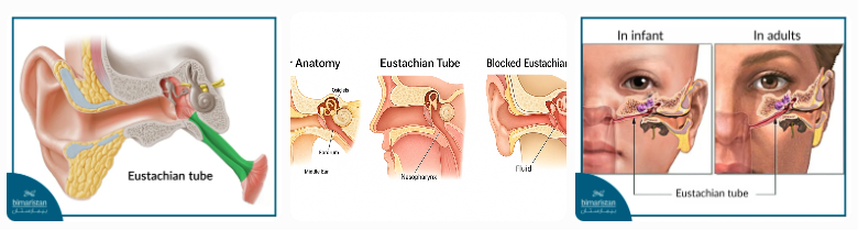 (Images above show Eustachian tube dysfunction — anatomy of the Eustachian tube, its connection to the middle ear, and blocked tube with fluid accumulation.)